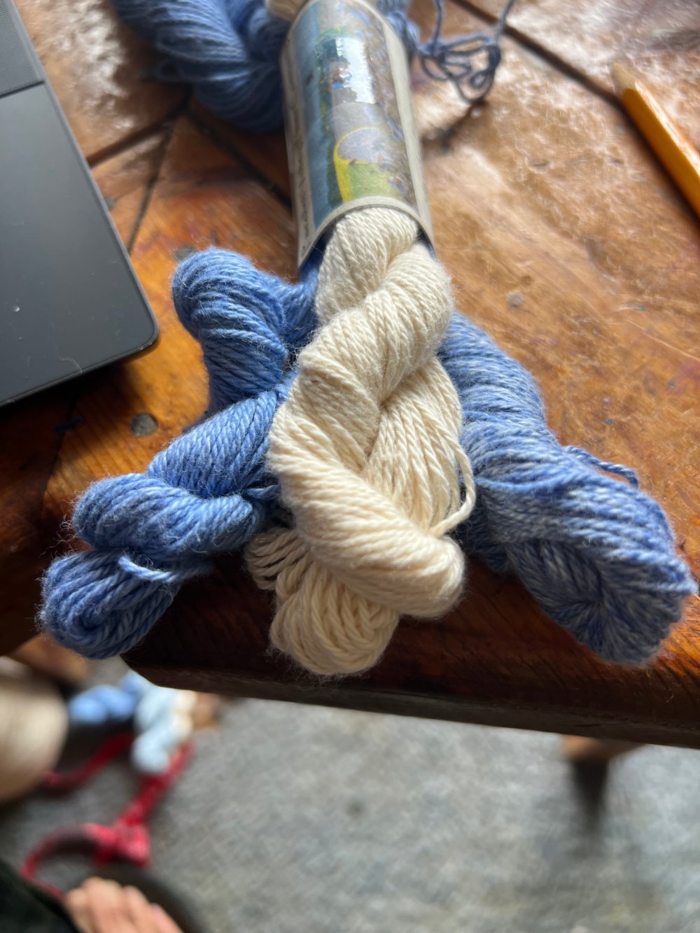 Pictured are groups of Southern Bales, Heather and Twisted that all went into their prospective dye pots together. The Southern Bales is the top yarn, the Heather is on the lower right, the Twisted on the left.